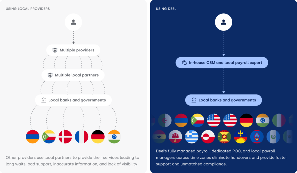No more inconsistent reporting and SLAs from multiple systems. Rely on one process and POC for each country with Deel.